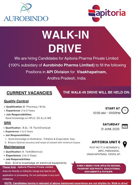 Apitoria Pharma- Walk in Drive for B.Pharm, MSc, BSc in QC, SRS on 21-06-2025