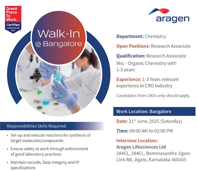 Aragen Lifesciences- Walk In Drive For Chemistry Department on 21st June 2025 Aragen Lifesciences- Walk In Drive For Chemistry Department on 21st June 2025 Post Views: 840 Job Category: Pharma Job Type: Full Time Job Location: BANGALORE Apply for this position Full Name *Email *Phone *Cover Letter *Upload CV/Resume *Allowed Type(s): .pdf, .doc, .docxBy using this form you agree with the storage and handling of your data by this website. *