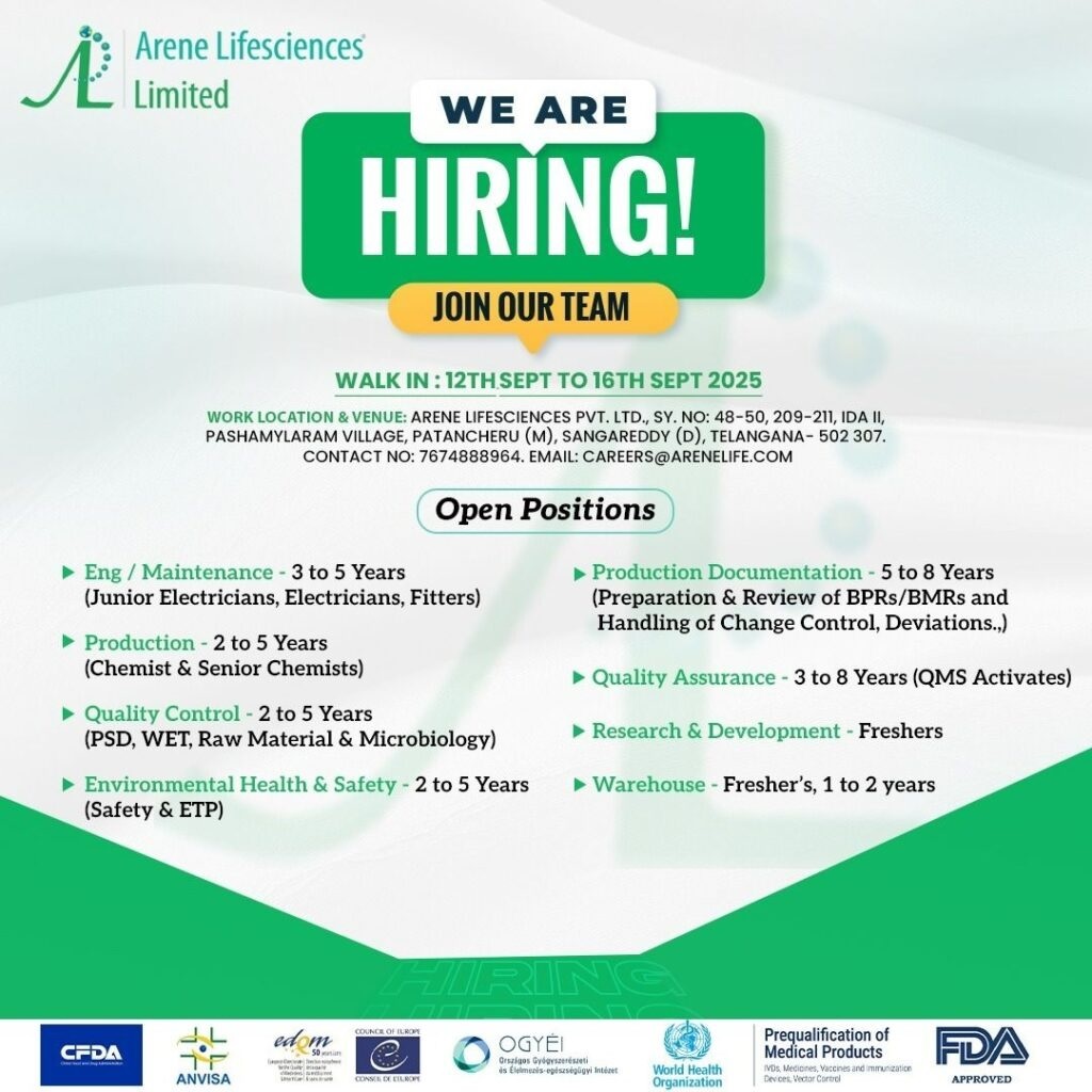 Arene Lifesciences- Walk-In Drive for Multiple Openings on 12th to 16th September 2025 Arene Lifesciences- Walk-In Drive for Multiple Openings on 12th to 16th September 2025 Post Views: 314 Job Category: Pharma Job Type: Full Time Job Location: Sangareddy Apply for this position Full Name *Email *Phone *Cover Letter *Upload CV/Resume *Allowed Type(s): .pdf, .doc, .docxBy using this form you agree with the storage and handling of your data by this website. *
