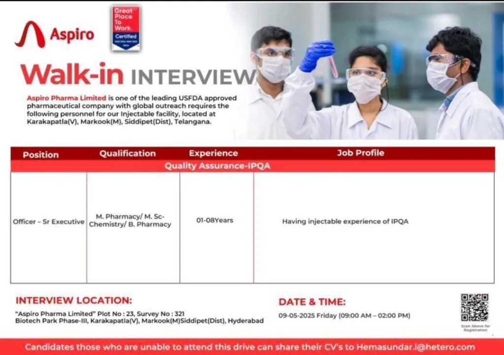 Aspiro Pharma- Walk in Drive for M.Pharm, B.Pharm, MSc in Quality Assurance on 09-05-2025