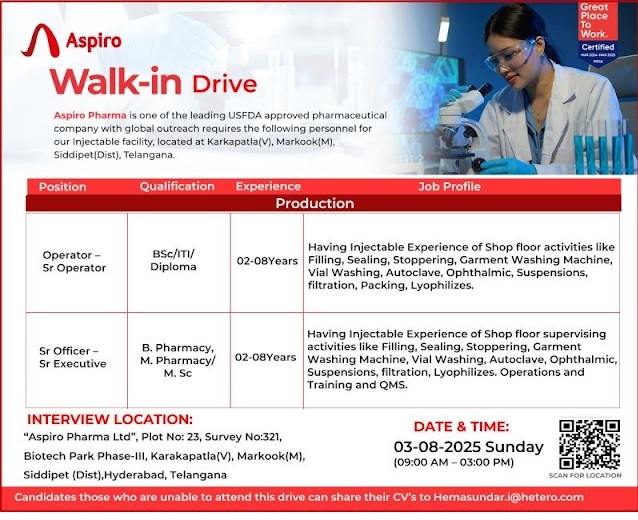 - Job Profile: Injectable experience in shop floor operations like Filling, Sealing, Stoppering, Garment Washing Machine, Vial Washing, Autoclave, Ophthalmic, Suspensions, Filtration, Packing, Lyophilization