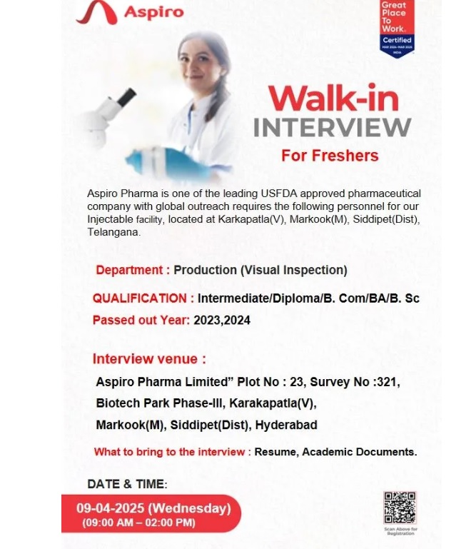 Aspiro-Walk-in Interview For Freshers on 09-04-2025 Aspiro-Walk-in Interview For Freshers on 09-04-2025 Post Views: 689 Job Category: Pharma Job Type: Full Time Job Location: Hyderabad Apply for this position Full Name *Email *Phone *Cover Letter *Upload CV/Resume *Allowed Type(s): .pdf, .doc, .docxBy using this form you agree with the storage and handling of your data by this website. *