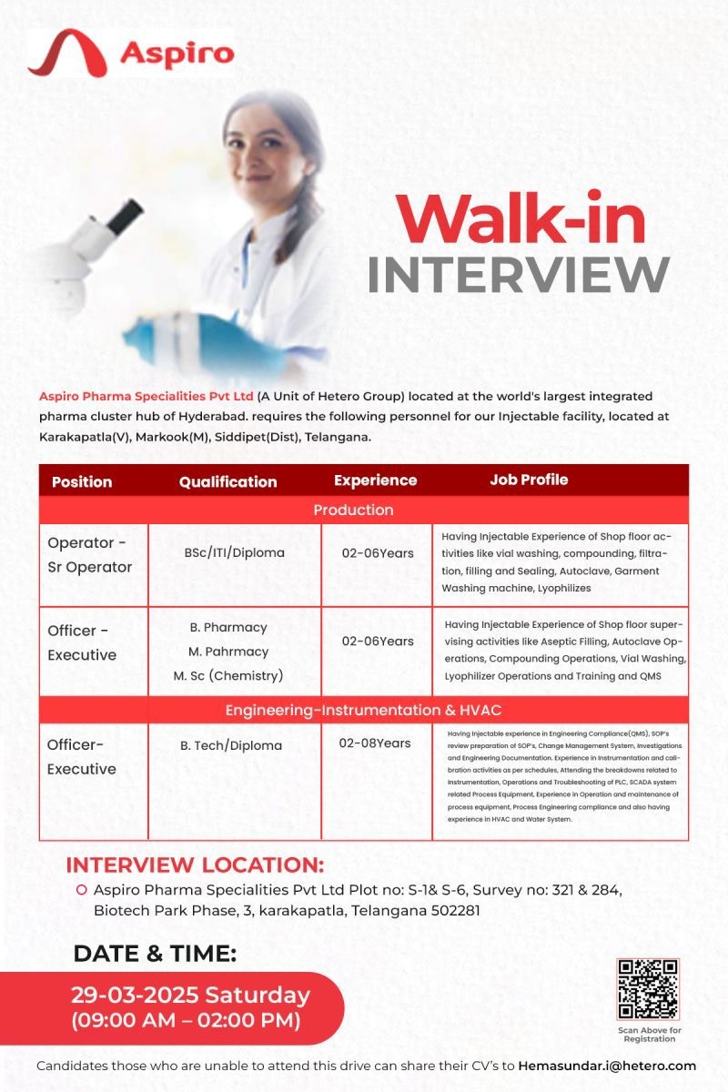 Aspiro Pharma Specialities Pvt Ltd (A Unit of Hetero Group) located at the world’s largest integrated pharma cluster hub of Hyderabad. requires the following personnel for our Injectable facility, located at Karakapatla (V), Markook (M), Siddipet (Dist), Telangana.