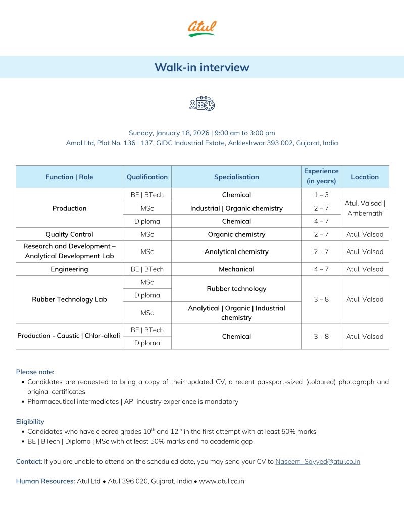 Atul Ltd -Walk-In Interview for Production, QC, R&D, Engineering on 18 January 2026 @ Gujarat