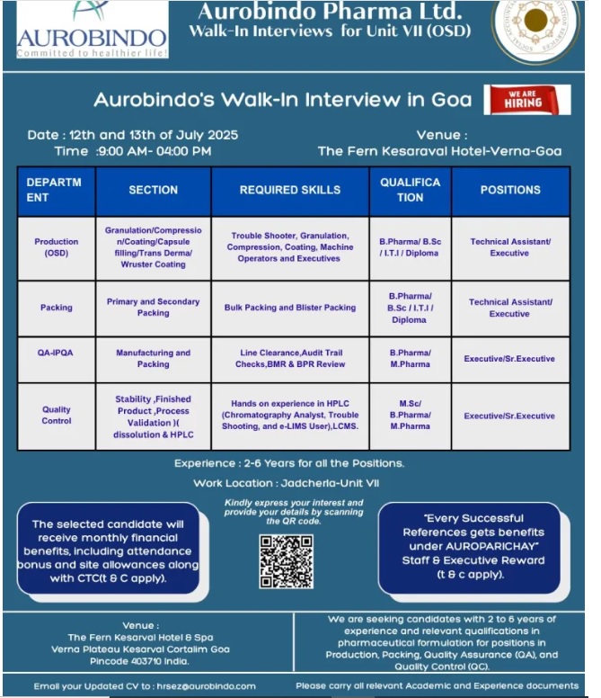 Aurobindo Pharma Limited – Unit VII and build a thriving career in the pharmaceutical industry. We’re conducting a Walk-In Interview for multiple roles across Production, Packing, QA, and QC departments. If you have relevant experience and the passion to work with regulatory-driven OSD formulations,