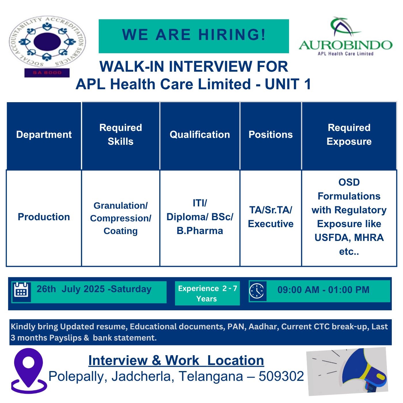 Aurobindo Pharma- Walk-In – Production OSD Manufacturing on 26th July 2025 Aurobindo Pharma- Walk-In – Production OSD Manufacturing on 26th July 2025 Post Views: 320 Job Category: Pharma Job Type: Full Time Job Location: jadcherla Apply for this position Full Name *Email *Phone *Cover Letter *Upload CV/Resume *Allowed Type(s): .pdf, .doc, .docxBy using this form you agree with the storage and handling of your data by this website. *