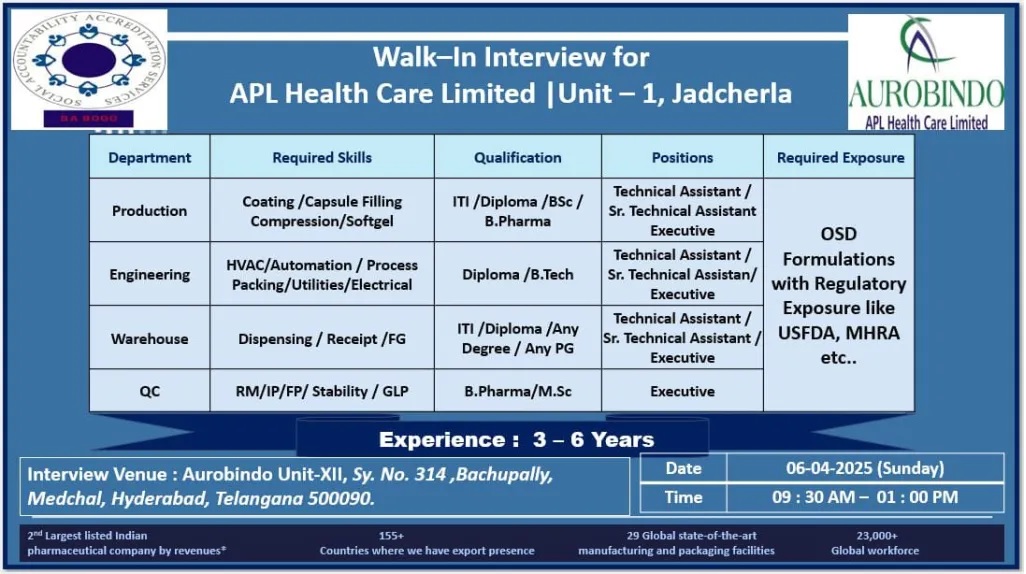 Interview Venue: Aurobindo Unit-XII, Sy. No. No. ,Bachupally, Medchal, Hyderabad, Telangana 500090.