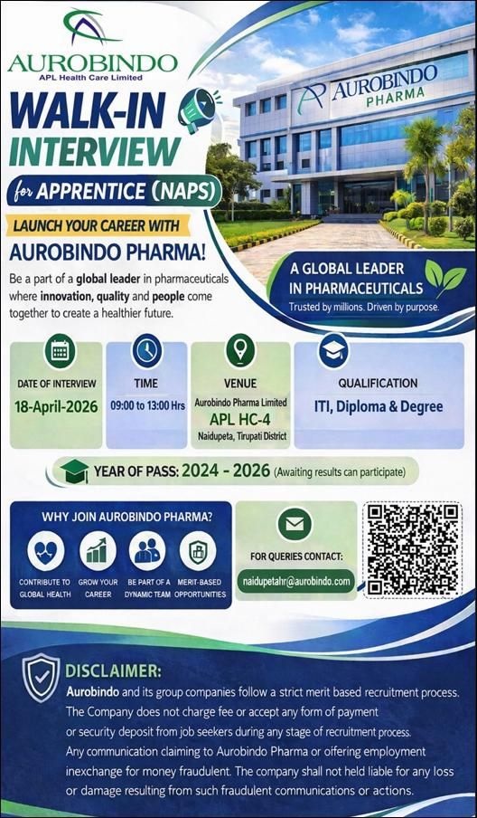Aurobindo Pharma- Walk In Interview for Apprentice NAPS on 18-April-2026