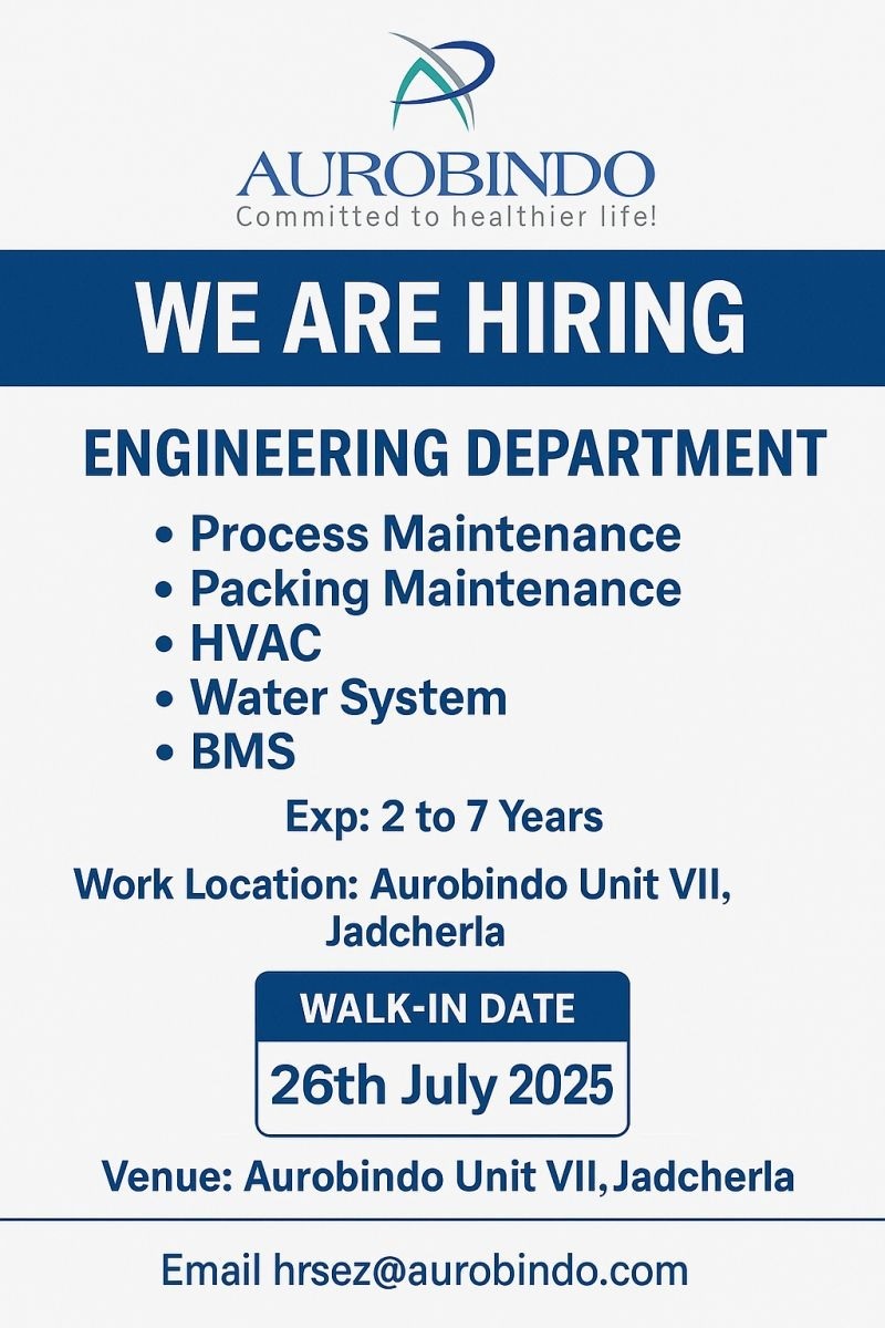 Aurobindo Pharma- Walk In Interview For Engineering on 26th July 2025 Aurobindo Pharma- Walk In Interview For Engineering on 26th July 2025 Post Views: 273 Job Category: Pharma Job Type: Full Time Job Location: Hyderabad Apply for this position Full Name *Email *Phone *Cover Letter *Upload CV/Resume *Allowed Type(s): .pdf, .doc, .docxBy using this form you agree with the storage and handling of your data by this website. *