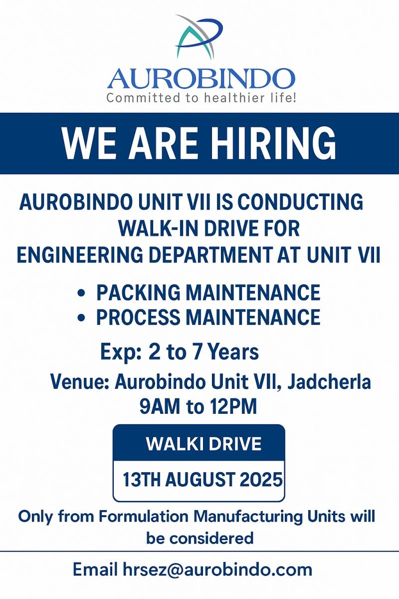 Aurobindo Pharma- Walk-in Interview For Engineering on 13th August 2025 Aurobindo Pharma- Walk-in Interview For Engineering on 13th August 2025 Post Views: 540 Job Category: Pharma Job Type: Full Time Job Location: Aurobindo Unit VII Apply for this position Full Name *Email *Phone *Cover Letter *Upload CV/Resume *Allowed Type(s): .pdf, .doc, .docxBy using this form you agree with the storage and handling of your data by this website. *