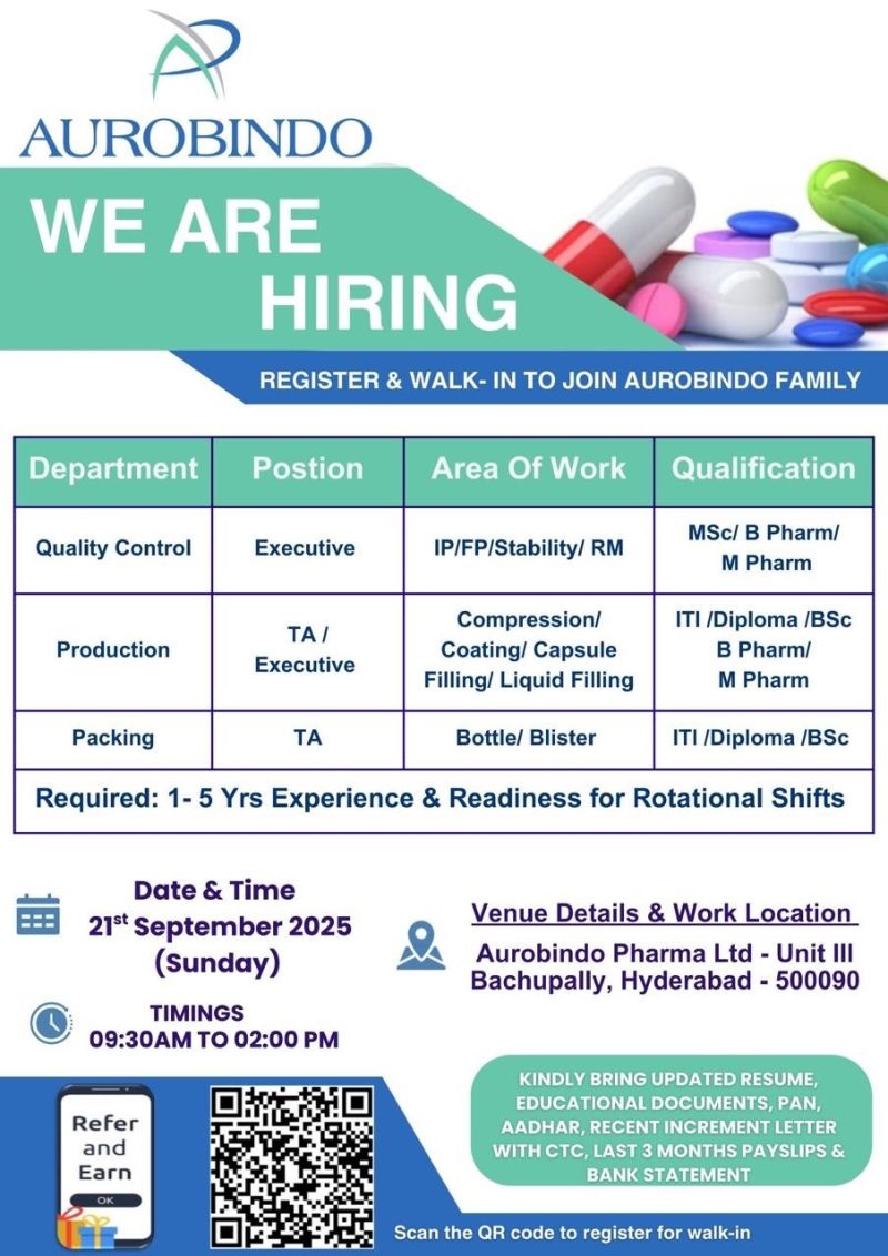 Aurobindo Pharma -Walk In Interview For QC, Production & Packing on 21st Sept’ 2025 Aurobindo Pharma -Walk In Interview For QC, Production & Packing on 21st Sept’ 2025 Post Views: 222 Job Category: Pharma Job Type: Full Time Job Location: Hyderabad Apply for this position Full Name *Email *Phone *Cover Letter *Upload CV/Resume *Allowed Type(s): .pdf, .doc, .docxBy using this form you agree with the storage and handling of your data by this website. *