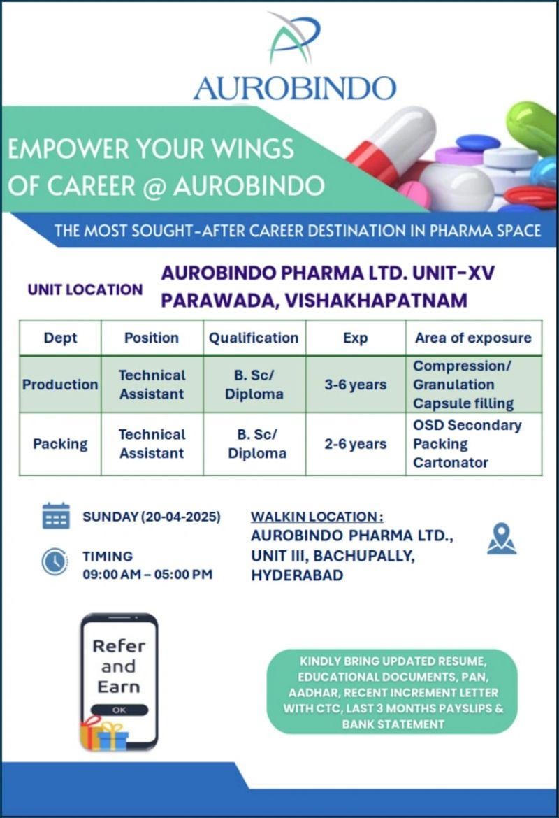 Aurobindo Pharma-Walk in Interview for Production & Packing on 20th April 2025 Aurobindo Pharma-Walk in Interview for Production & Packing on 20th April 2025 Post Views: 993 Job Category: Pharma Job Type: Full Time Job Location: Bachupally Unit III Apply for this position Full Name *Email *Phone *Cover Letter *Upload CV/Resume *Allowed Type(s): .pdf, .doc, .docxBy using this form you agree with the storage and handling of your data by this website. *