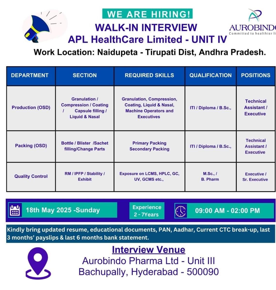 Aurobindo- Walk In Interview For QC/Packing/Production on 18th May 2025 Aurobindo- Walk In Interview For QC/Packing/Production on 18th May 2025 Post Views: 994 Job Category: Pharma Job Type: Full Time Job Location: Hyderabad Apply for this position Full Name *Email *Phone *Cover Letter *Upload CV/Resume *Allowed Type(s): .pdf, .doc, .docxBy using this form you agree with the storage and handling of your data by this website. *
