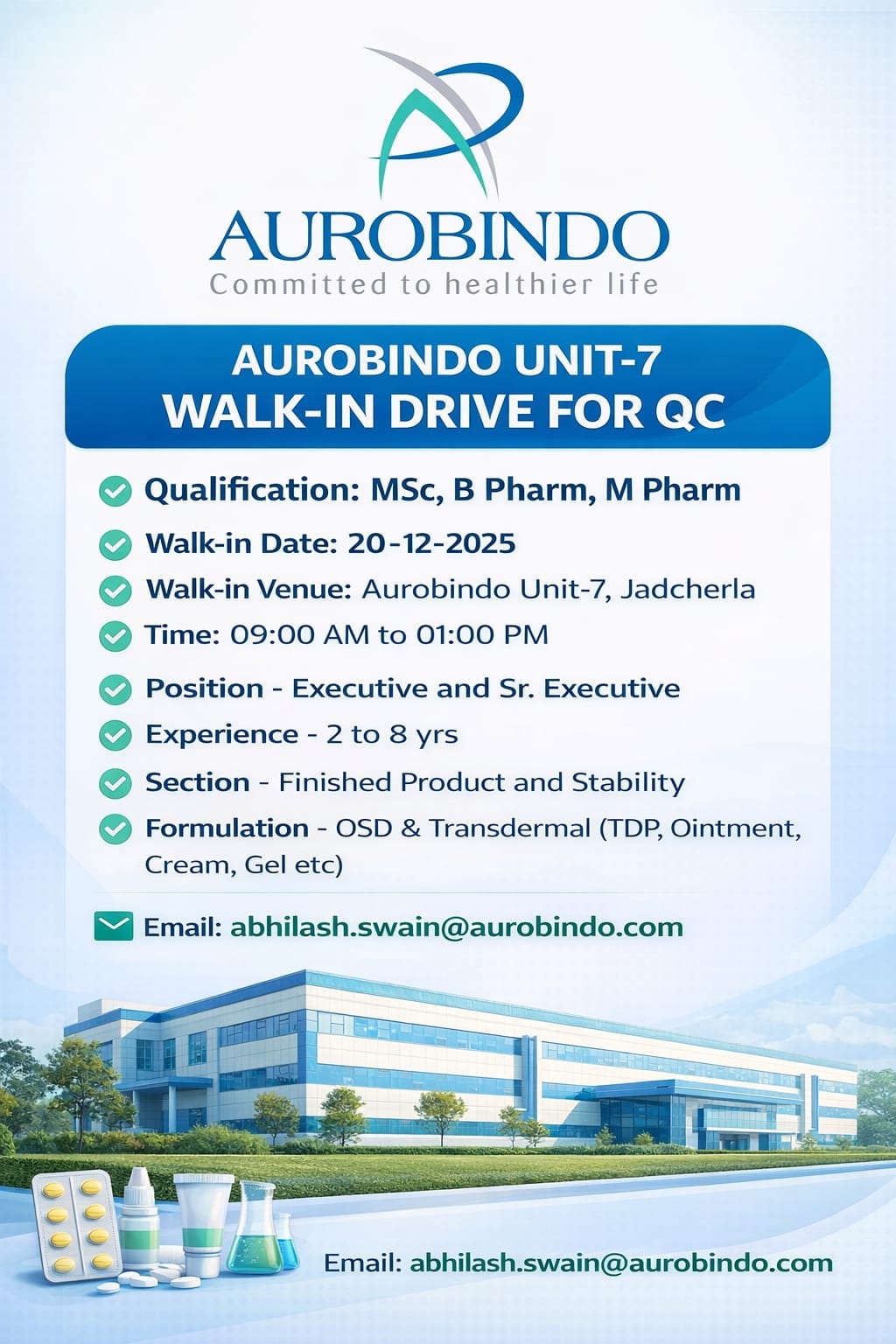 AUROBINDO-WALK-IN DRIVE FOR QC ON 20-12-2025 AUROBINDO-WALK-IN DRIVE FOR QC ON 20-12-2025 Post Views: 225 Job Category: Pharma Job Type: Full Time Job Location: jadcherla Unit 7 Apply for this position Full Name *Email *Phone *Cover Letter *Upload CV/Resume *Allowed Type(s): .pdf, .doc, .docxBy using this form you agree with the storage and handling of your data by this website. *