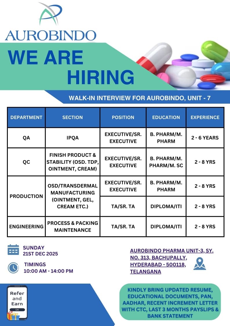 AUROBINDO-WALK-IN INTERVIEW ON 21ST DEC 2025 @UNIT – 7 AUROBINDO-WALK-IN INTERVIEW ON 21ST DEC 2025 @UNIT – 7 Post Views: 278 Job Category: Pharma Job Type: Full Time Job Location: Hyderabad Apply for this position Full Name *Email *Phone *Cover Letter *Upload CV/Resume *Allowed Type(s): .pdf, .doc, .docxBy using this form you agree with the storage and handling of your data by this website. *