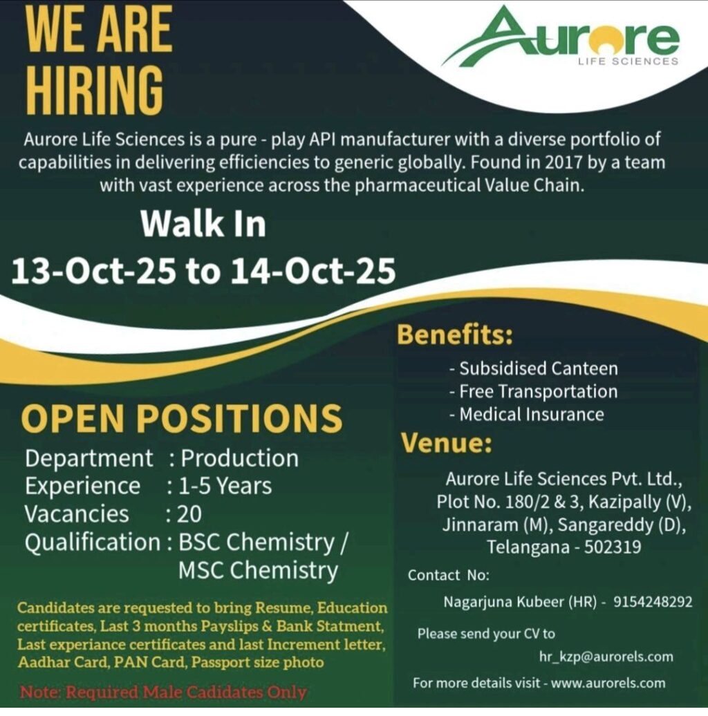Aurore Life Sciences walk in for Production on 13th & 14th October 2025 Aurore Life Sciences walk in for Production on 13th & 14th October 2025 Post Views: 404 Job Category: Pharma Job Type: Full Time Job Location: Jinnaram (M) Kazipally (V) Sangareddy (D) Apply for this position Full Name *Email *Phone *Cover Letter *Upload CV/Resume *Allowed Type(s): .pdf, .doc, .docxBy using this form you agree with the storage and handling of your data by this website. *