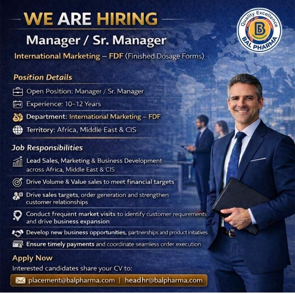 Bal Pharma- Hiring Manager / Sr. Manager Jobs in International Marketing (FDF) Bal Pharma- Hiring Manager / Sr. Manager Jobs in International Marketing (FDF) Post Views: 83 Job Category: Pharma Job Type: Full Time Apply for this position Full Name *Email *Phone *Cover Letter *Upload CV/Resume *Allowed Type(s): .pdf, .doc, .docxBy using this form you agree with the storage and handling of your data by this website. *