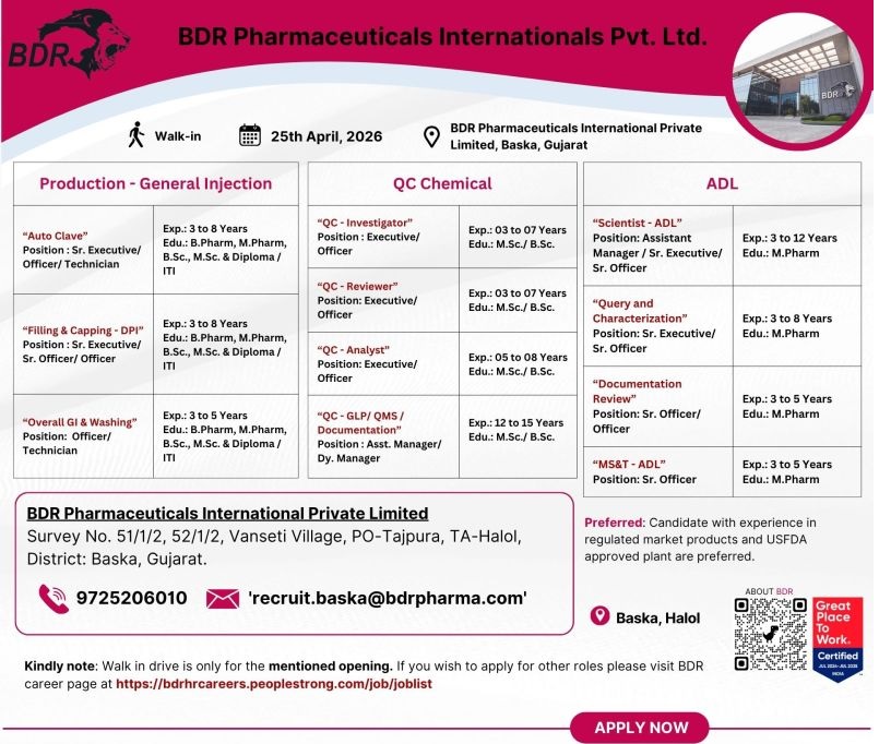 Venue : BDR Pharmaceuticals International Private Limited, Baska, Gujarat
