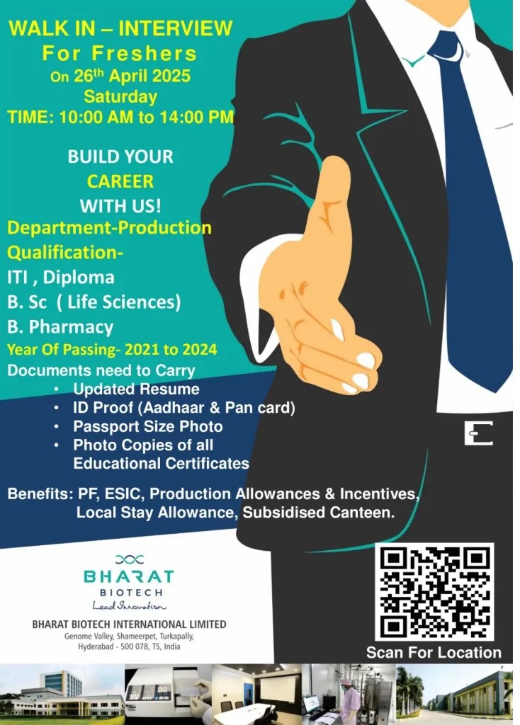 Bharat Biotech International Limited, a pioneer in innovative biotechnology solutions, is organizing a Walk-In Interview exclusively for freshers on 26th April 2025 (Saturday). If you aspire to kickstart your career in the pharmaceutical production sector, this is an incredible opportunity you don’t want to miss!