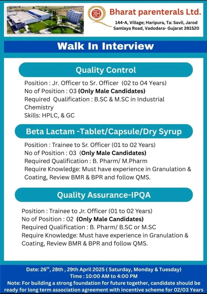 Bharat Parenterals Ltd-Walk-In Interview for QC, QA & Beta Lactam Positions on April 26, 28, 29, 2025 Bharat Parenterals Ltd-Walk-In Interview for QC, QA & Beta Lactam Positions on April 26, 28, 29, 2025 Post Views: 1,307 Job Category: Pharma Job Type: Full Time Job Location: Vadodara Apply for this position Full Name *Email *Phone *Cover Letter *Upload CV/Resume *Allowed Type(s): .pdf, .doc, .docxBy using this form you agree with the storage and handling of your data by this website. *