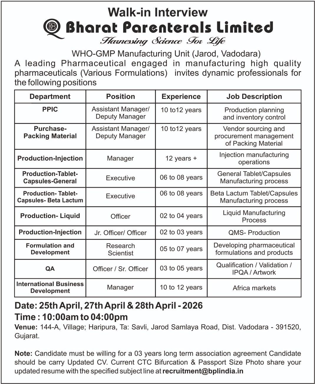 Bharat Parenterals -Walk-In Interview for Production, QA, PPIC, Purchase, and R&D on 25th,27th, & 28th April 2026 @Vadodara Bharat Parenterals -Walk-In Interview for Production, QA, PPIC, Purchase, and R&D on 25th,27th, & 28th April 2026 @Vadodara Post Views: 4 Job Category: Pharma Job Type: Full Time Job Location: Gujarat Apply for this position Full Name *Email *Phone *Cover Letter *Upload CV/Resume *Allowed Type(s): .pdf, .doc, .docxBy using this form you agree with the storage and handling of your data by this website. *