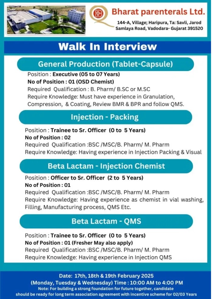 Bharat Parenterals- Walk-in interview for Freshers & Experienced on 17th to 19th Feb 2025 Bharat Parenterals- Walk-in interview for Freshers & Experienced on 17th to 19th Feb 2025 Shop – Post Views: 915 Job Category: Pharma Job Type: Full Time Job Location: Ahmedabad Apply for this position Full Name *Email *Phone *Cover Letter *Upload CV/Resume *Allowed Type(s): .pdf, .doc, .docxBy using this form you agree with the storage and handling of your data by this website. *