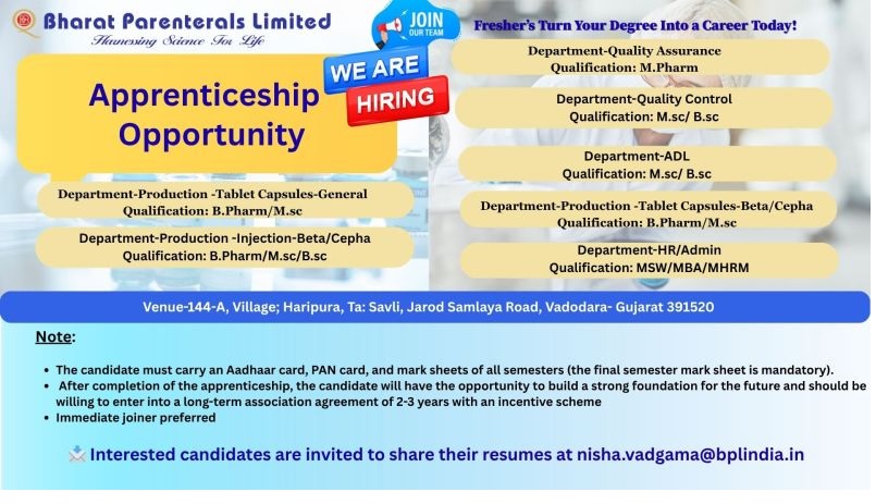 • After completion of the apprenticeship, the candidate will have the opportunity to build a strong foundation for the future and should be willing to enter into a long-term association agreement of 2-3 years with an incentive scheme