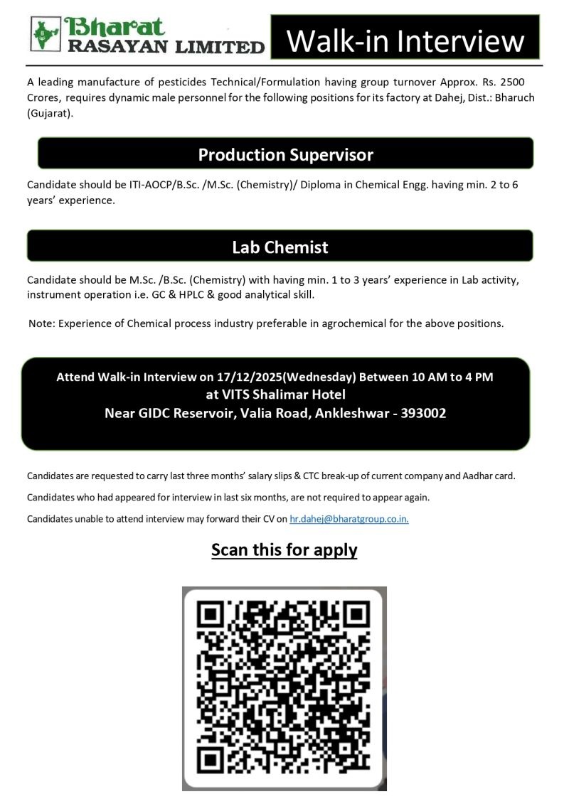 Bharat Rasayan Ltd- Walk In Interview For Production Supervisors & Lab Chemists on December 17, 2025 Bharat Rasayan Ltd- Walk In Interview For Production Supervisors & Lab Chemists on December 17, 2025 Post Views: 95 Job Category: Pharma Job Type: Full Time Job Location: Ankleshwar Apply for this position Full Name *Email *Phone *Cover Letter *Upload CV/Resume *Allowed Type(s): .pdf, .doc, .docxBy using this form you agree with the storage and handling of your data by this website. *