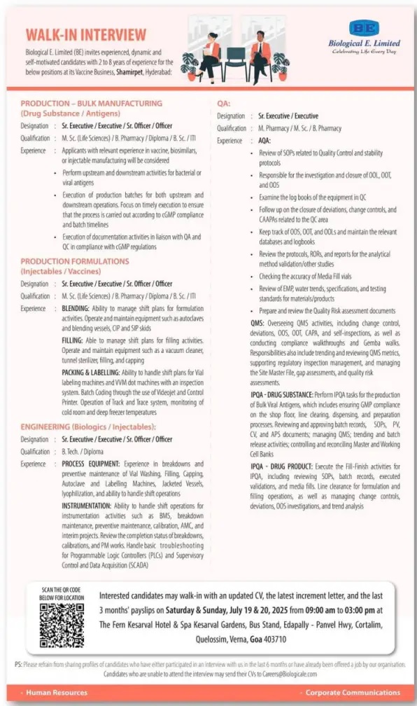 Biological E. Limited- Walk in M.Pharm, B.Pharm, MSc candidates in Production, QA July 19 & 20,2025@ Verna, Goa