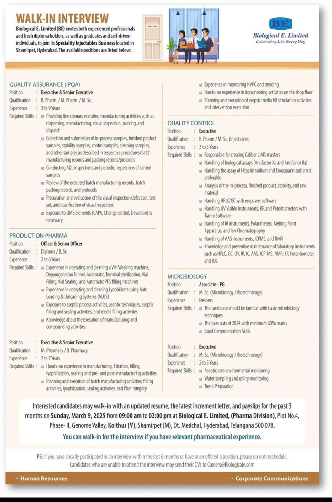 Biological E. Limited (BE) invites experienced, dynamic, and self-motivated candidates as well as fresh diploma holders, graduates, and post-graduates in life sciences for the following positions at our Specialty Injectables Business in Shamirpet, Hyderabad.