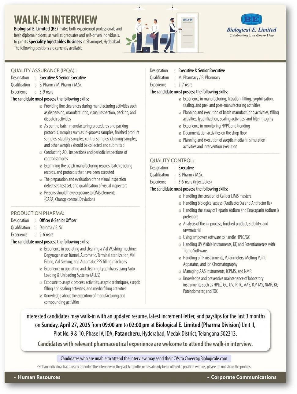 Interested candidates may walk-in with an updated resume, latest increment letter, and payslips for the last 3 months on Sunday, April 27,2025 from 09:00 am to 02:00 pm at Biological E. Limited (Pharma Division) Unit II, Plot No. 9 & 10, Phase IV, IDA, Patancheru, Hyderabad, Medak District, Telangana 502313. Candidates with relevant pharmaceutical experience are welcome to attend the walk-in interview. Candidates who are unable to attend the interview may send their CVs to [email protected]