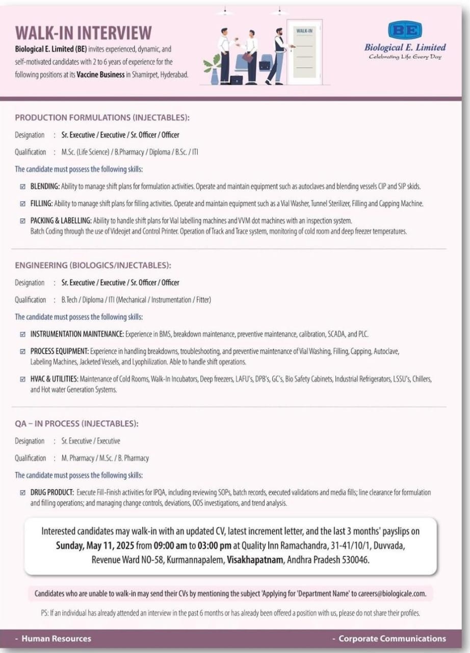 Biological E. Limited-Walk in Drive for M.Pharm, B.Pharm, MSc in Production, QA on May 11,2025