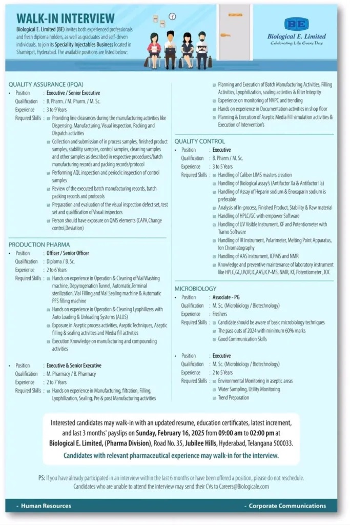 Interested candidates may walk-in with an updated resume, education certificates, latest increment, and last 3 months’ payslips on Sunday, February 16,2025 from 09:00 am to 02:00 pm at Biological E. Limited, (Pharma Division), Road No. 35, Jubilee Hills, Hyderabad, Telangana 500033. Candidates with relevant pharmaceutical experience may walk-in for the interview.