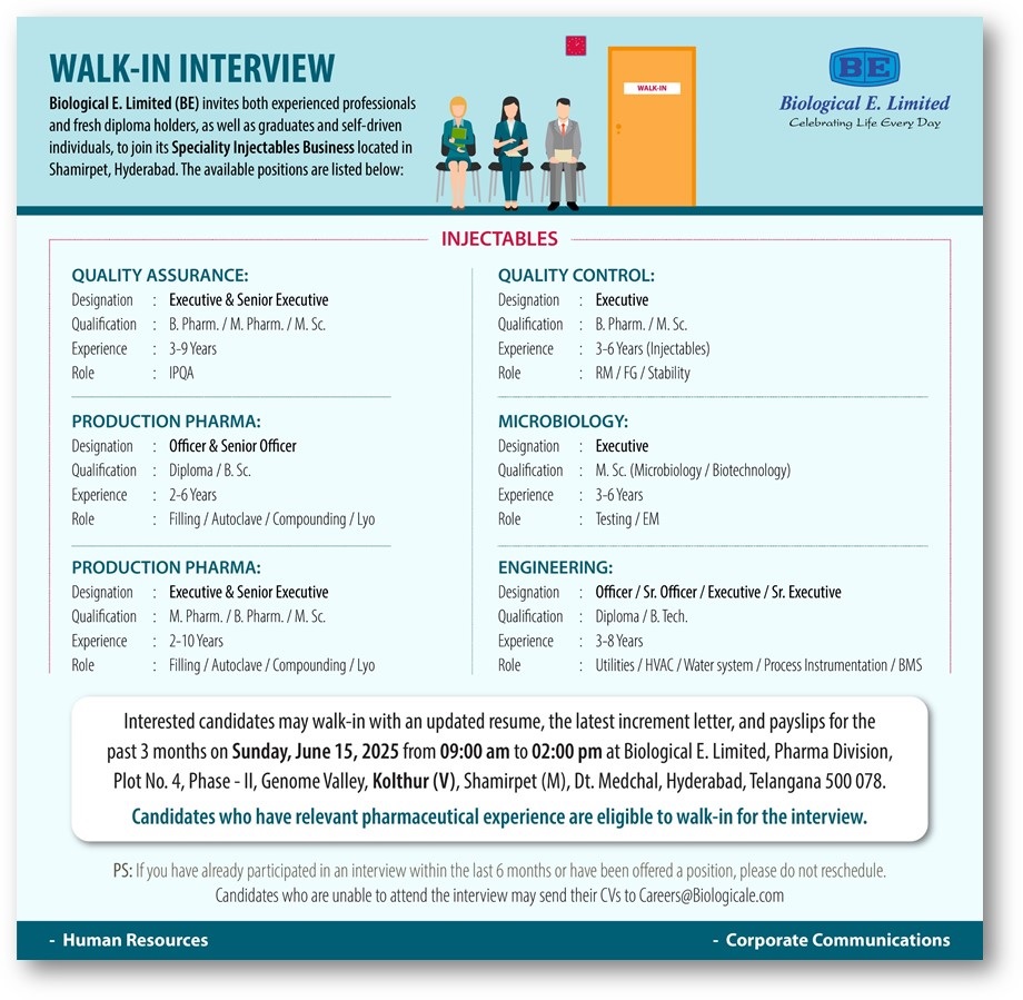 Biological E. Limited-Walk-In Interview on June 15, 2025 Biological E. Limited-Walk-In Interview on June 15, 2025 Post Views: 946 Job Category: Pharma Job Type: Full Time Job Location: Hyderabad Apply for this position Full Name *Email *Phone *Cover Letter *Upload CV/Resume *Allowed Type(s): .pdf, .doc, .docxBy using this form you agree with the storage and handling of your data by this website. *