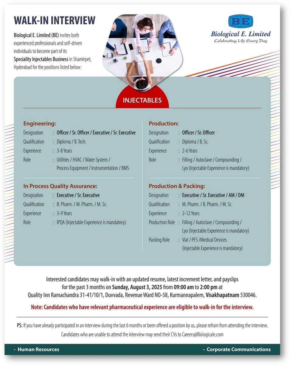 Biological E -Walk-In Interview for Production, IPQA & Engineering on August 3, 2025 @Hyderabad
