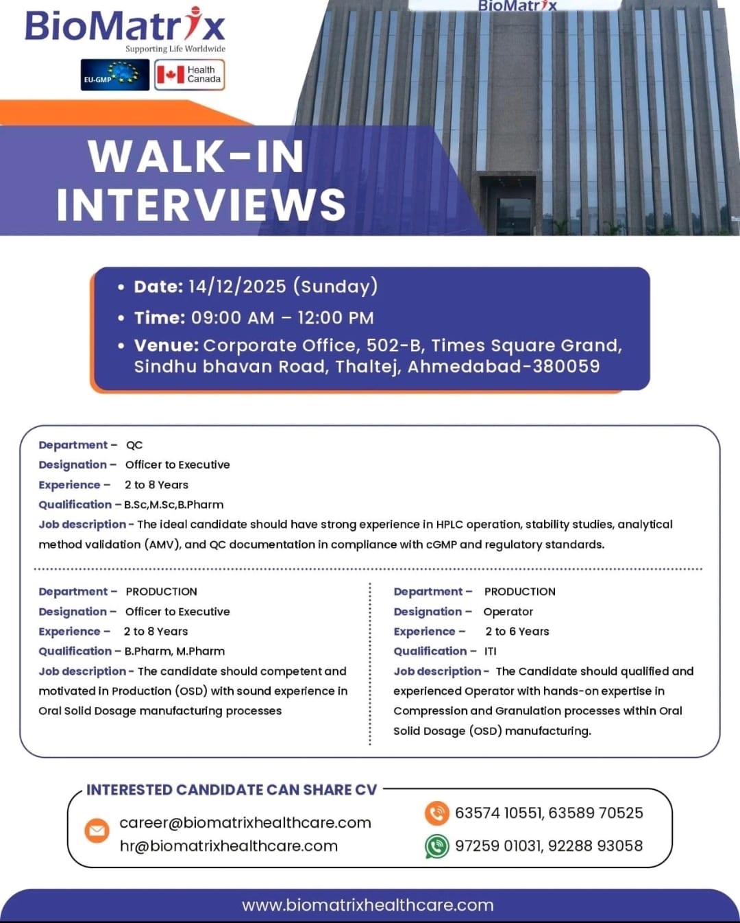BioMatrix Healthcare, an EU-GMP and Health Canada certified pharmaceutical company supporting life worldwide, is conducting walk-in interviews for motivated professionals to join our expanding teams in Quality Control (QC) and Production at our Ahmedabad facility.