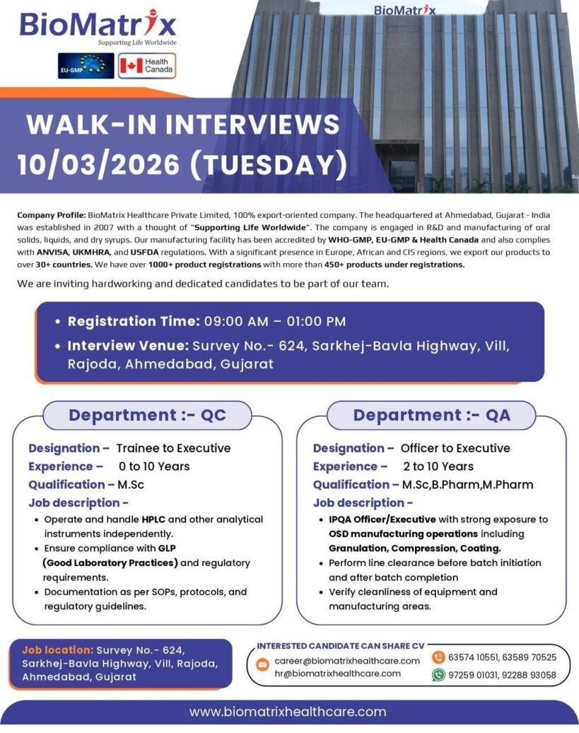 BioMatrix Healthcare- Walk-In Interview for QC & QA on 10th March 2026