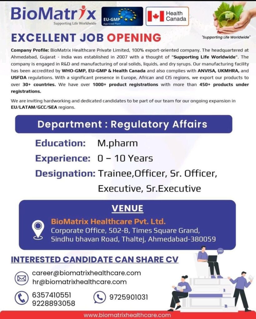 Biomatrix-opening for Regulatory Affairs Apply Now Biomatrix-opening for Regulatory Affairs Apply Now Post Views: 197 Job Category: Pharma Job Type: Full Time Job Location: Ahmedabad Apply for this position Full Name *Email *Phone *Cover Letter *Upload CV/Resume *Allowed Type(s): .pdf, .doc, .docxBy using this form you agree with the storage and handling of your data by this website. *