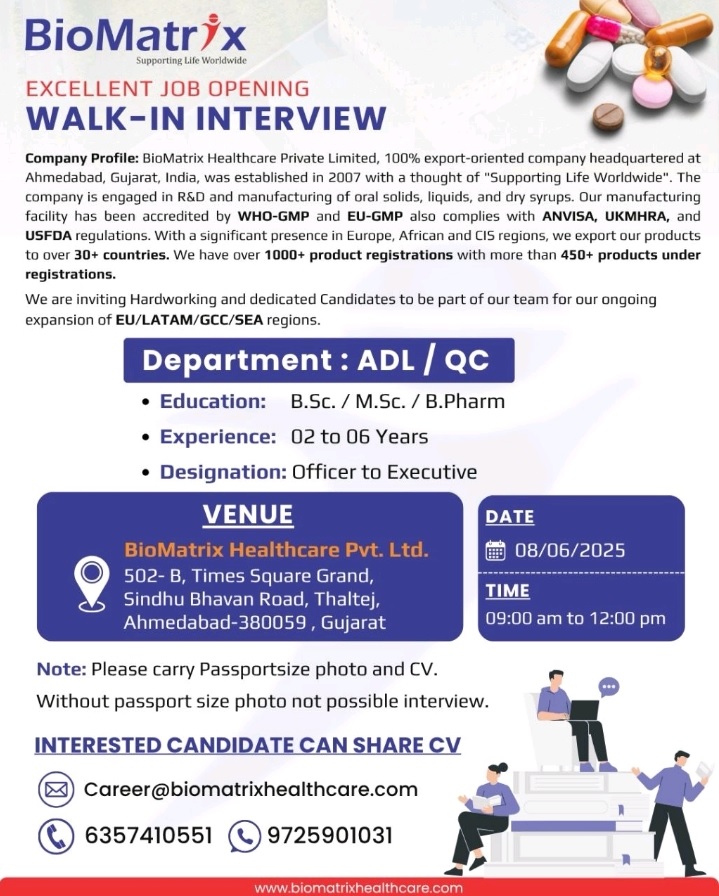 Biomatrix- Walk in Interview for ADL / QC on 8th June 2025 @Ahmedabad