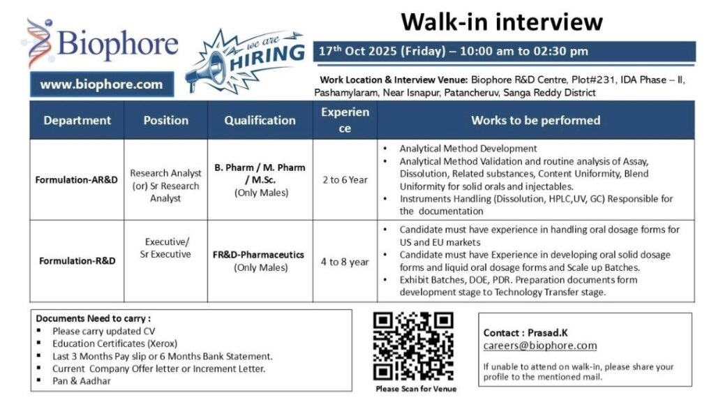 Venue:Biophore R&D Centre, Plot #231, IDA Phase – II, Pashamylaram,