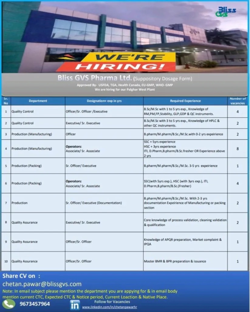 Bliss GVS Pharma Limited- Hiring for Quality Control, Production, Packing & Quality Assurance Department