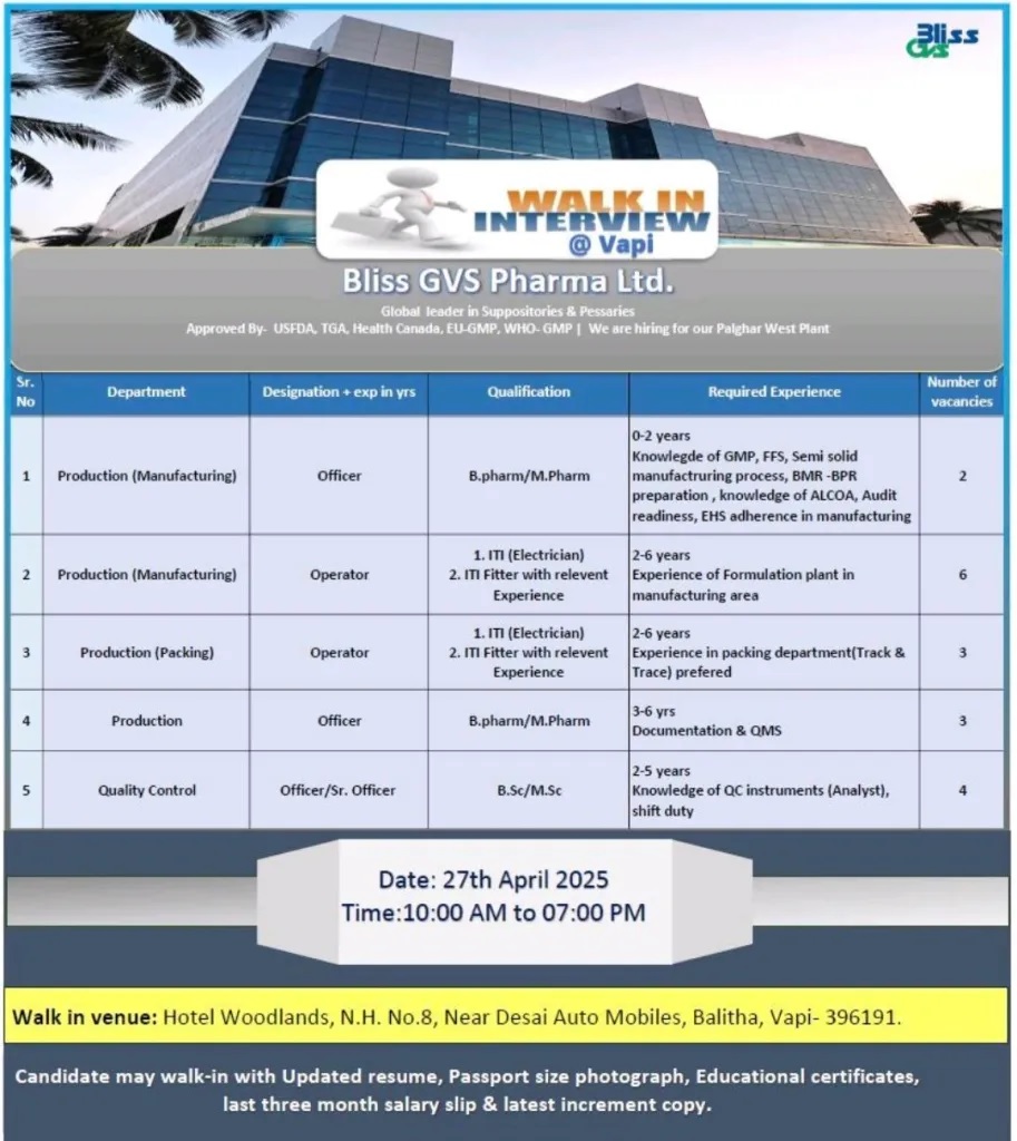Bliss GVS Pharma -Walk-In for Production & Quality Control on 27th April 2025 Bliss GVS Pharma -Walk-In for Production & Quality Control on 27th April 2025 Post Views: 1,150 Job Category: Pharma Job Type: Full Time Job Location: Vapi Apply for this position Full Name *Email *Phone *Cover Letter *Upload CV/Resume *Allowed Type(s): .pdf, .doc, .docxBy using this form you agree with the storage and handling of your data by this website. *
