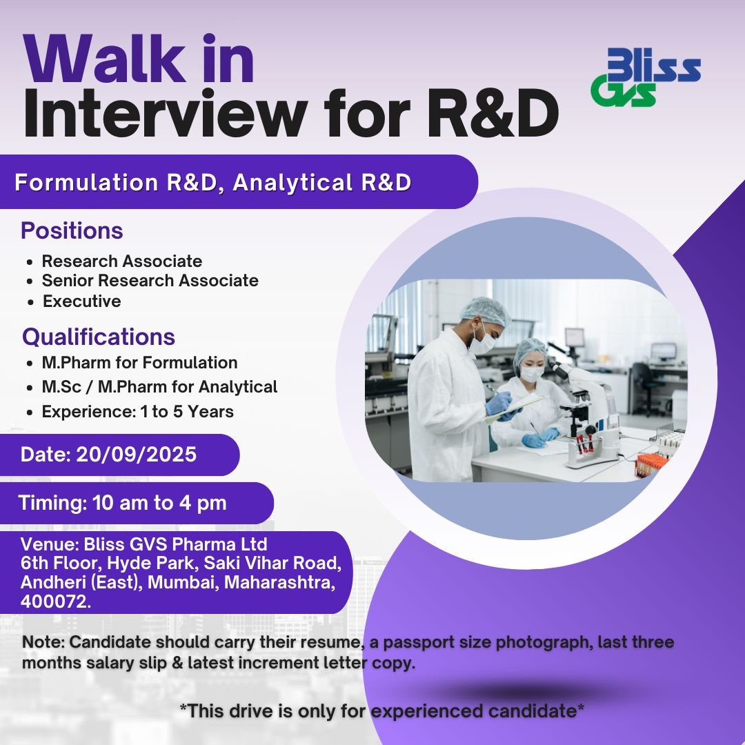 Bliss GVS-Walk-In Interview R&D Formulation & Analytical Research on 20th Sept’2025 Bliss GVS-Walk-In Interview R&D Formulation & Analytical Research on 20th Sept’2025 Post Views: 301 Job Category: Pharma Job Type: Full Time Job Location: Maharashtra Apply for this position Full Name *Email *Phone *Cover Letter *Upload CV/Resume *Allowed Type(s): .pdf, .doc, .docxBy using this form you agree with the storage and handling of your data by this website. *