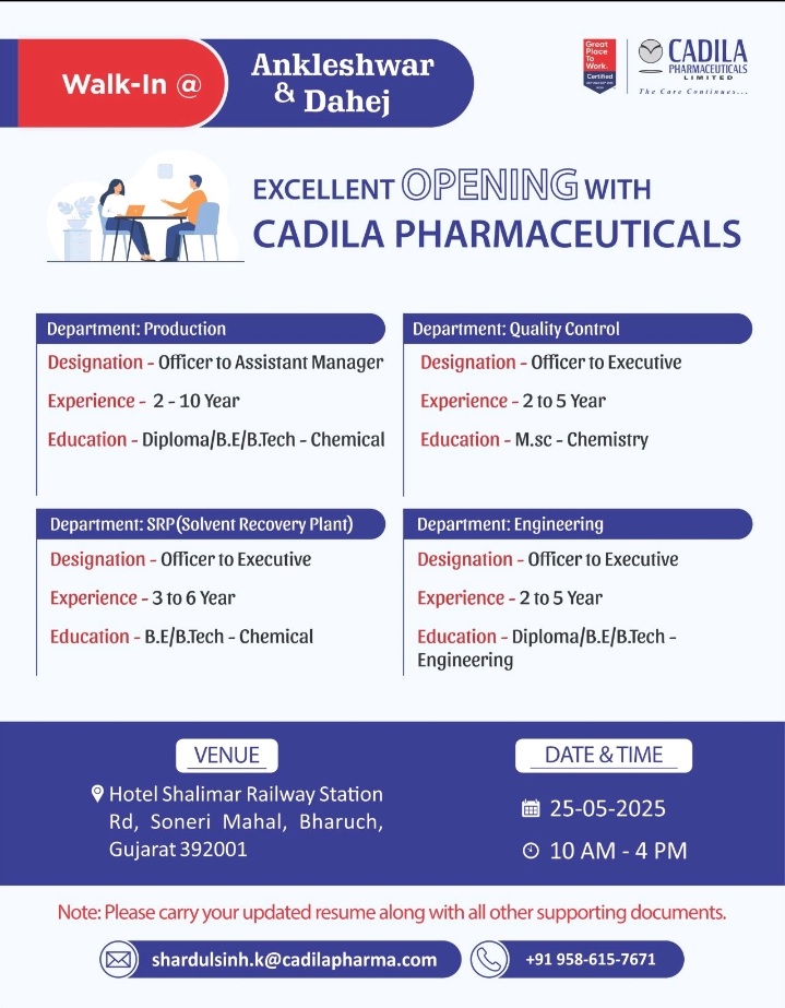 Cadila Pharma- walk in interview for Production, SRP, Quality Control and Engineering on 25-05-2025 @ Ankleshwar &Dahej