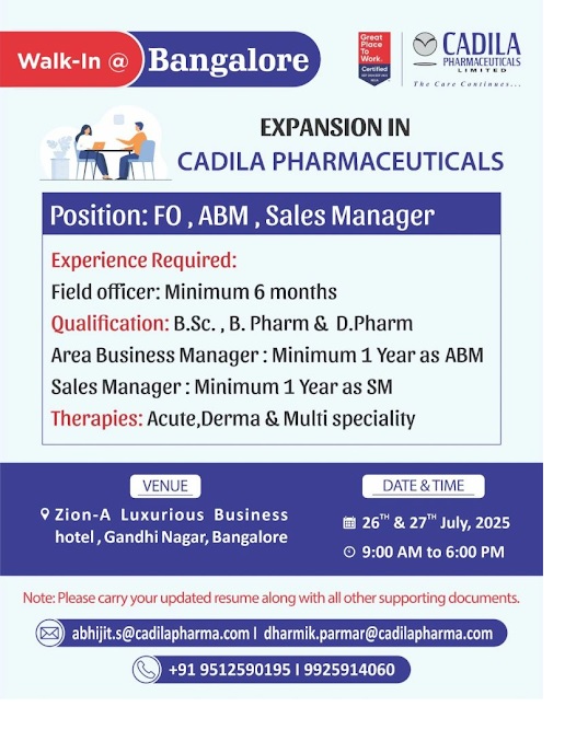 Cadila Pharma- Walk-In Interview On 26th & 27th July 2025 Cadila Pharma- Walk-In Interview On 26th & 27th July 2025 Post Views: 531 Job Category: Pharma Job Type: Full Time Job Location: BANGALORE Apply for this position Full Name *Email *Phone *Cover Letter *Upload CV/Resume *Allowed Type(s): .pdf, .doc, .docxBy using this form you agree with the storage and handling of your data by this website. *