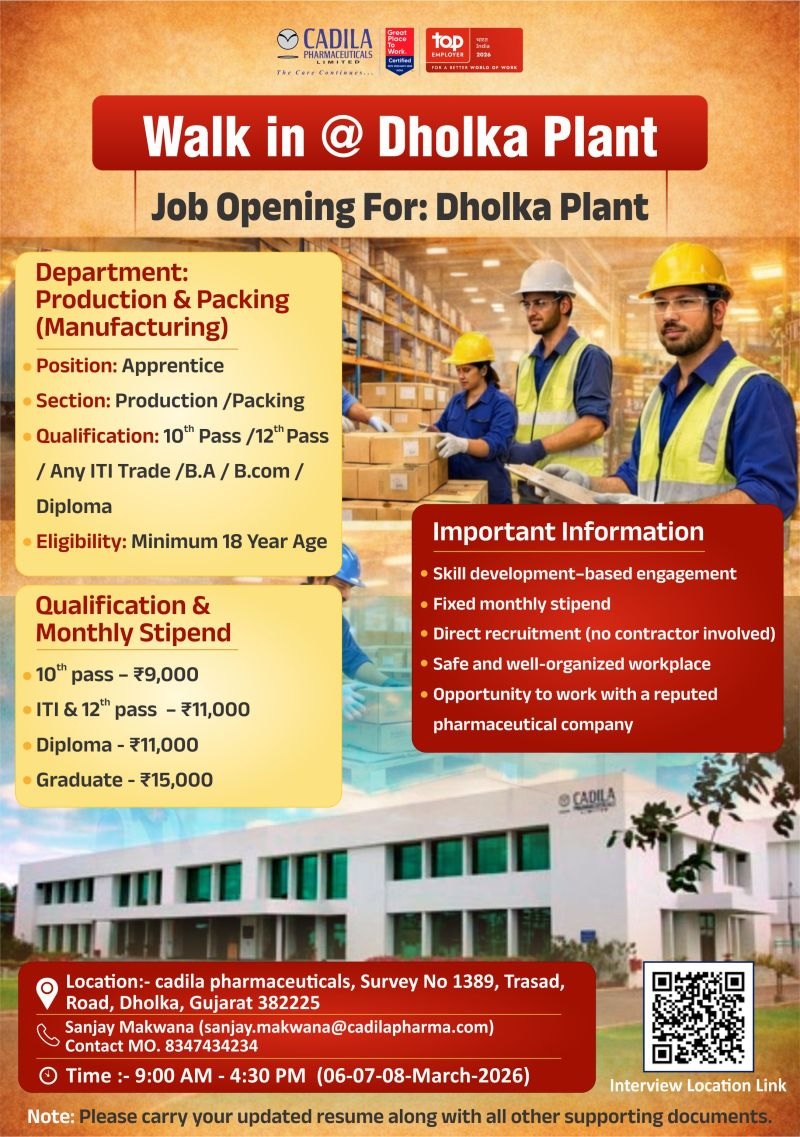 Cadila Pharmaceuticals -Freshers Walk-In Interview for Production & Packing on 06,07& 08 March 2026 Cadila Pharmaceuticals -Freshers Walk-In Interview for Production & Packing on 06,07& 08 March 2026 Post Views: 46 Job Category: Pharma Job Type: Full Time Job Location: Dholka plant Apply for this position Full Name *Email *Phone *Cover Letter *Upload CV/Resume *Allowed Type(s): .pdf, .doc, .docxBy using this form you agree with the storage and handling of your data by this website. *