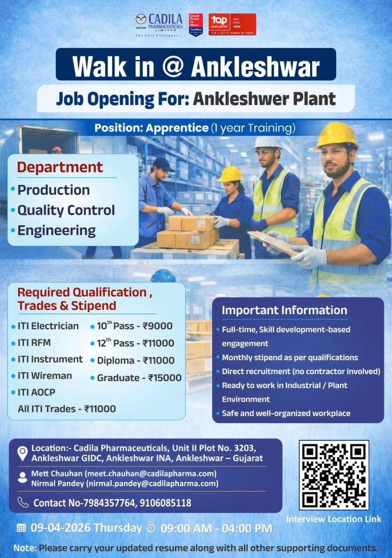 Cadila Pharmaceuticals- Walk In Interview for Apprentice-Freshers on 9th April 2026@Ankleshwar Cadila Pharmaceuticals- Walk In Interview for Apprentice-Freshers on 9th April 2026@Ankleshwar Post Views: 36 Job Category: Pharma Job Type: Full Time Job Location: Ankleshwar Apply for this position Full Name *Email *Phone *Cover Letter *Upload CV/Resume *Allowed Type(s): .pdf, .doc, .docxBy using this form you agree with the storage and handling of your data by this website. *