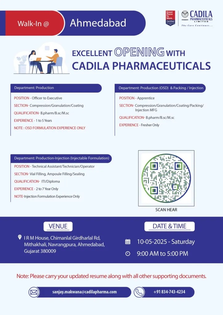Cadila Pharmaceuticals -Walk in for OSD & Injectable Production on 10th May 2025 Cadila Pharmaceuticals -Walk in for OSD & Injectable Production on 10th May 2025 Date: Saturday, 10th May 2025 Time: 9:00 AM to 5:00 PM Venue:IRM House, Chimanlal Girdharlal Road,Mithakhali, Navrangpura,Ahmedabad, Gujarat – 380009 1. Production (OSD – Oral Solid Dosage) Position: Officer to Executive Section: Compression, Granulation, Coating Qualification: B.Pharm / B.Sc / M.Sc Experience: 1 to 5 years Note: Experience in OSD formulation is mandatory 2. Production (OSD) & Packing/Injection Position: Apprentice Section: Compression, Granulation, Coating, Packing, Injection Manufacturing Qualification: B.Pharm / B.Sc / M.Sc Experience: Freshers only 3. Production – Injection (Injectable Formulation) Position: Technical Assistant / Technician / Operator Section: Vial Filling, Ampoule Filling, Sealing Qualification: ITI / Diploma Experience: 2 to 7 years Note: Experience in injectable formulation is required Sanjay Makwana (HR)📧 Email: [email protected]📱 Phone: +91 834-743-4234 Post Views: 727 Job Category: Pharma Job Type: Full Time Job Location: Ahmedabad Apply for this position Full Name *Email *Phone *Cover Letter *Upload CV/Resume *Allowed Type(s): .pdf, .doc, .docxBy using this form you agree with the storage and handling of your data by this website. *