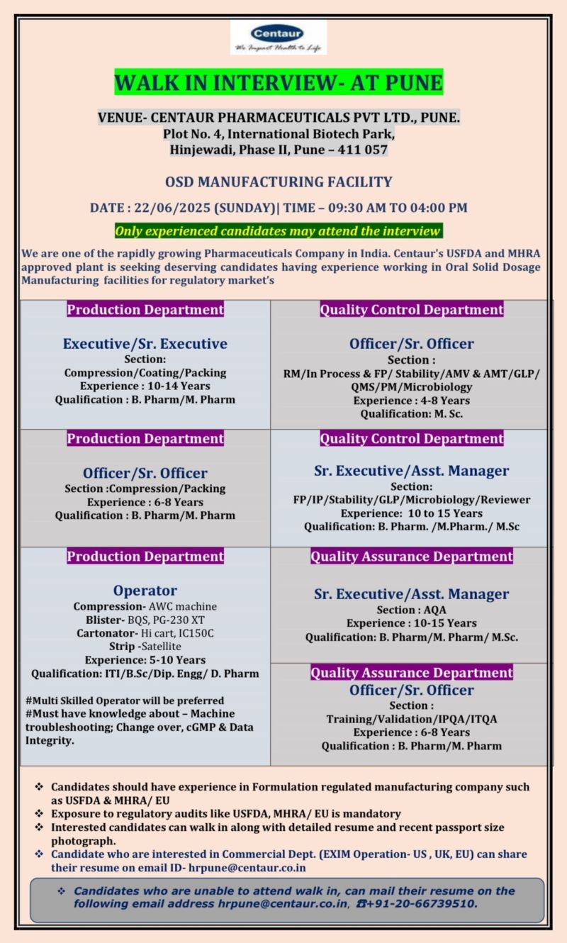 Centaur Pharma-Walk in Drive for M.Pharm, B.Pharm, MSc in Production, QA, QC on 22/06/2025