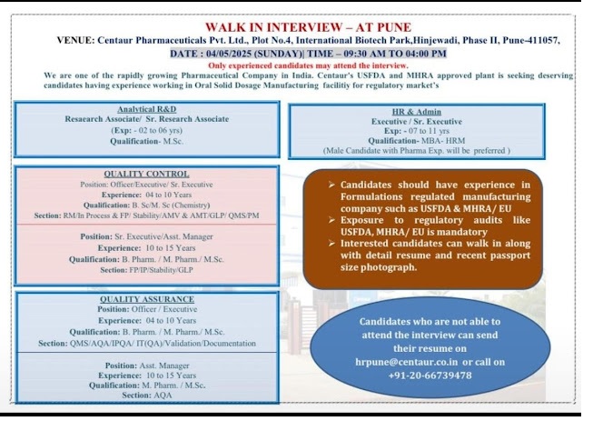 Centaur Pharma- Walk in Drive for M.Pharm, B.Pharm, MSc in Analytical R&D, QA, QC on 04/05/2025